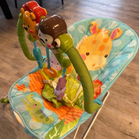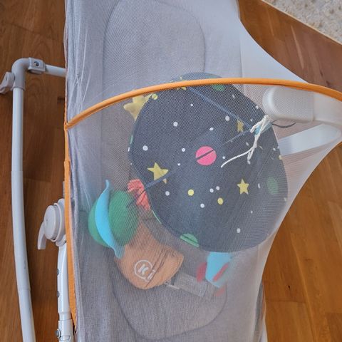 Selger en vippestol med leke. Den kan taes lett av. Trekket har vært vasket og er helt og fint.