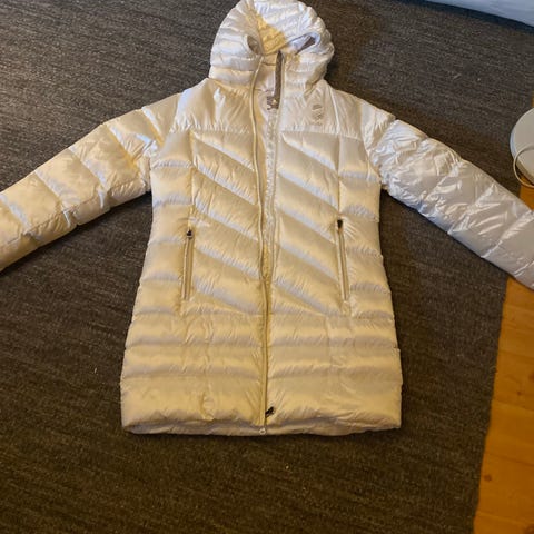 Fin halvlang kåpe i tynn dun. Innsving i midjen og lommer med glidelås i front. Så og si ubrukt.