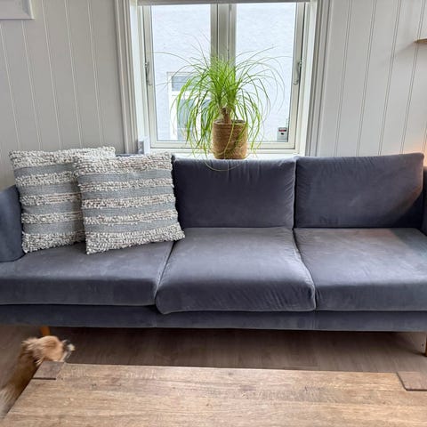 Pent brukt sofa fra SofaCompany i mørkeblå velour selges for kun 4500,-