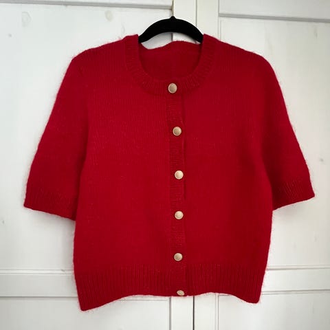 Håndstrikket kortermet cardigan i merinoull og mohair. Fargen er mørk brun. Str xs/s. Mål: midt bak 50 cm, ermelengde målt fra undersiden 11 cm.