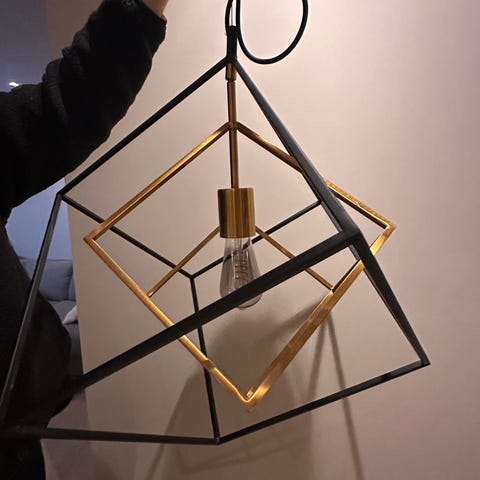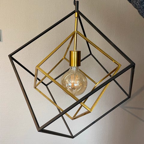 Selger en stilren og dekorativ Cubes taklampe i svart metall med detaljer i messing/gull. Lampen har et moderne, geometrisk design som gir et eksklusivt uttrykk og passer perfekt over spisebord, i stue eller gang.