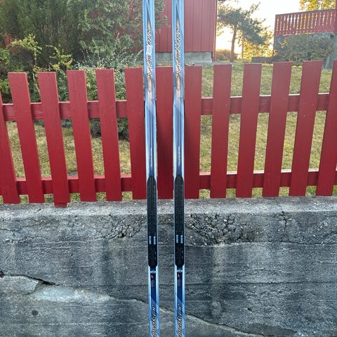 Madshus langrennsski med lengde , blå farge. Skiene er laget med materialer tilpasset langrenn og har bindinger for feste av sko. Passer til bruk på preparerte løyper.