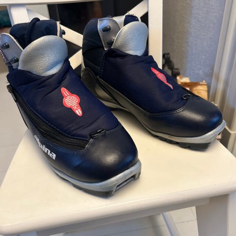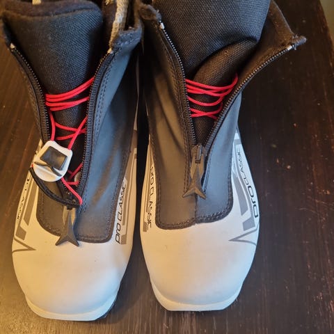 Gode skisko med mye bruk igjen, størrelse 39. Litt slitt på innsiden øverst på venstre sko. Ellers god stand.