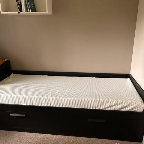 IKEA Brimnes dagseng i svart. Praktisk seng som enkelt kan trekkes ut til en dobbelseng. Godt med oppbevaringsplass i to skuffer under.