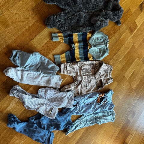 Klespakke str. 56 bestående av 5 bodyer, 4 bukser, 3 pysjer og en heldress.