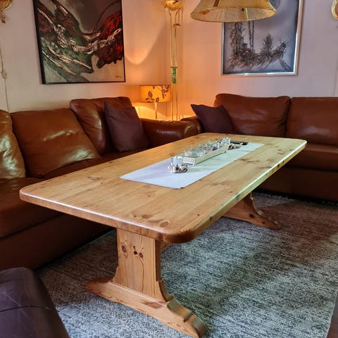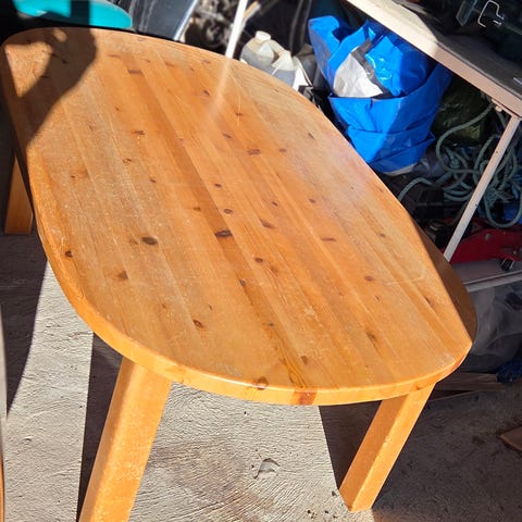 Ovalt salongbord furubord. Lakket.