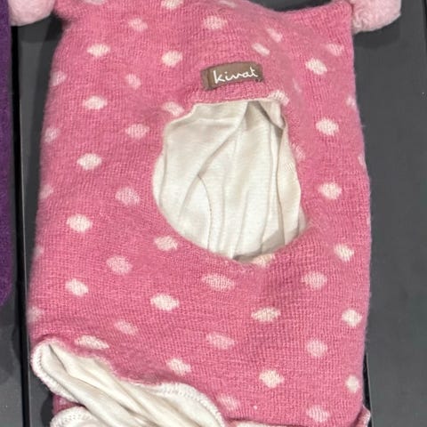 Kivat barnelue i bomull, farge rosa, størrelse 1. Designet for jenter. Brukt lue fra Kivat. Litt slitt øverst på knytelissene (se siste to bilder)