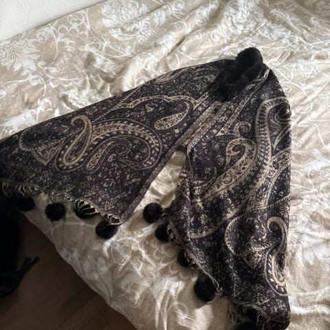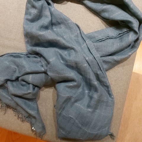 Silkeskjerf brukt som hodeplagg, kjøpt i Afghanistan. Et par bruksmerker som vist på bildene, det ene fra å feste skjerfet ved bruk. Nyvasket for hånd med ullvask.
