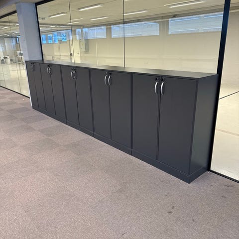 Elektrisk hev- og senkbart resepsjon/kontorbord i grå farge med flere skuffer og oppbevaringsrom. Skrivebordet har justerbar høyde med kontrollknapper for opp- og nedbevegelse. Passer til kontorbruk eller hjemmekontor.