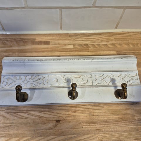 Knagglist i metall og tre med 5 kroker. Passer til oppheng av klær, vesker eller lignende. Enkel montering på vegg.