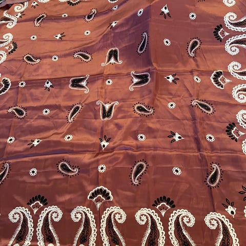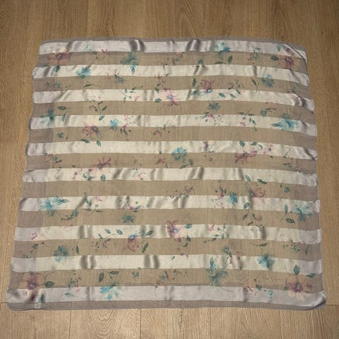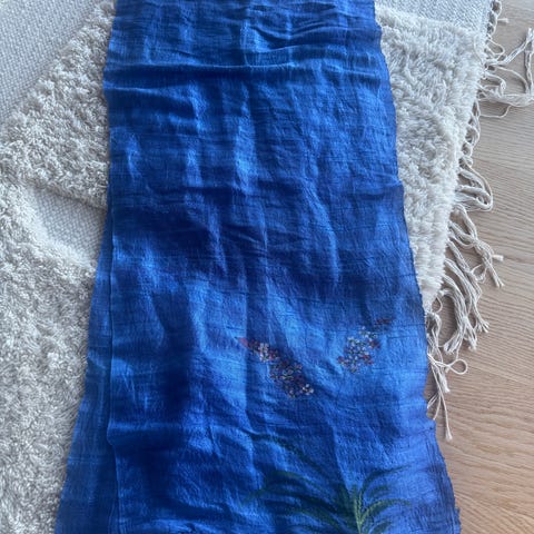 88*85cm har noen bruksmerker, silkemerke mangler. I blå marineblå og beige-gul roseblomst.