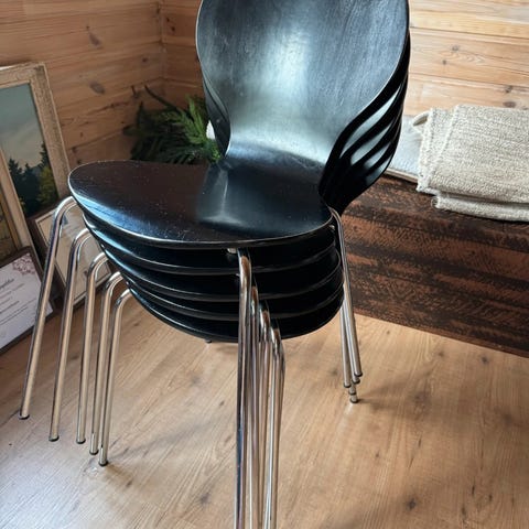 Selger 5 praktiske og stilrene stoler i svart tre med metallben. Stablbare og enkle å flytte – perfekt til kjøkken, spisestue eller hytte. Fire i god stand, én med litt mer brukspreg. Selges samlet rimelig.