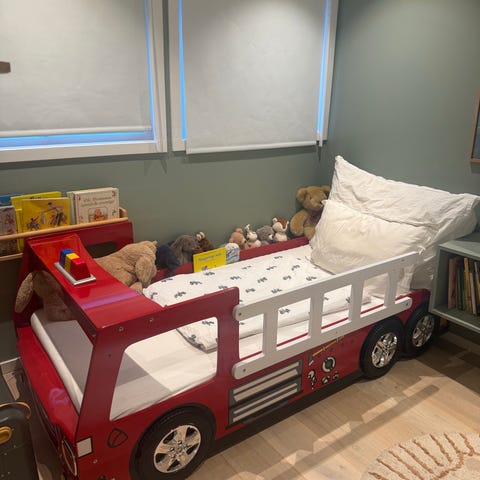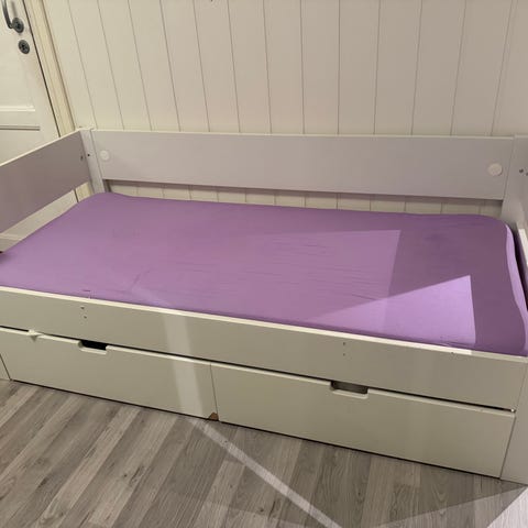 Juniorseng fra JLY med et stilrent design. Den har to paneler som hindrer barnet i å rulle ut av sengen og en praktisk skuff for lagring under. Perfekt som barnets første seng etter at de har vokst ut av grindsengen.