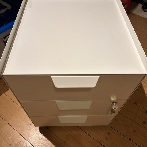 IKEA skrivebord med svart ramme og hvit skuffeseksjon. Skrivebordet har et enkelt og funksjonelt design, med tre skuffer i skuffeseksjonen for oppbevaring. Passer til kontor- eller hjemmekontorbruk.