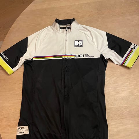 Santini Class sykkeltrøye i størrelse M, designet for herre. Trøyen har en rosa farge og er laget av 84% polyester og 10% elastan, med 6% elastan i enkelte deler for fleksibilitet. Produktet er produsert i Albania og har glidelås i front og lommer på baksiden.
