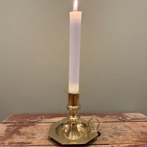 Vintage lysestake laget i messing. Passer til standard tynne lys og kan brukes som dekorativt element i hjemmet. Naturlig patina og bruksmerker kan forekomme. Lysåpning: 2,3 cm H: 18,5 cm. Søkeord: lysestake,,vintage,retro,lysestaker,stue,interiør,dekor, dekorasjon,stilrent,unik