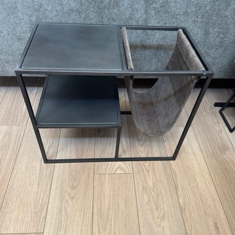 Pent sidebord i messing. Har stått med lampe på i et hjørne av stuen og er ikke brukt til noe annet enn å ha lampe på.