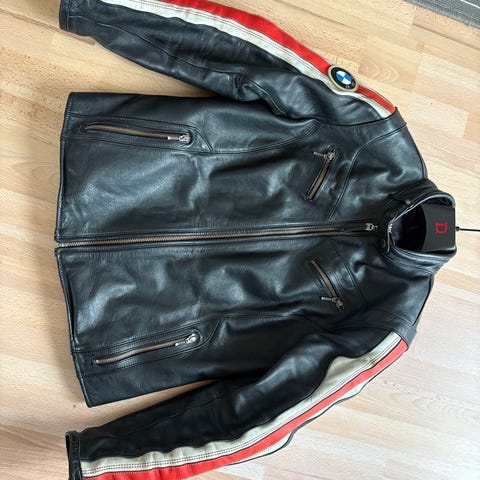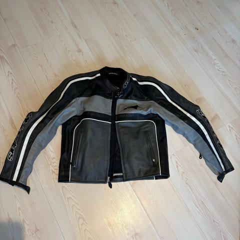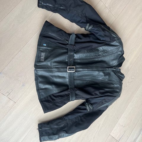 Ridetex skinnjakke for herre i svart med hvite striper. Jakken har glidelås foran, polstret design på ermene og justerbare stropper i livet. Innvendig fôr i stoffmateriale. Egnet for motorsykkelbruk eller som en moteriktig ytterjakke.