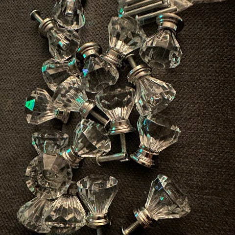 Fire ubrukte 30 mm knotter i glass med krom selges da jeg ikke fikk bruk for dem likevel. Passer til kommode, baderomsskap, kjøkkenskap og liknende. Kjøpt fra beslagonline.no i oktober for 396,- Selges samlet for 200,-