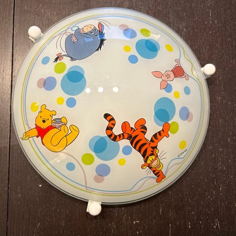 Taklampe med Tigergutt-motiv fra Ole Brum i glasset selges. Diameter ca 31 cm
