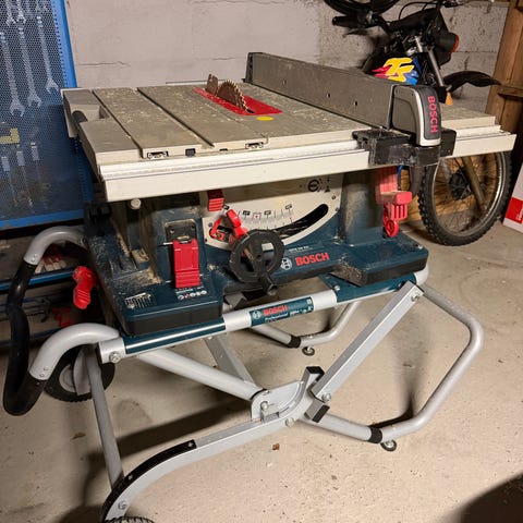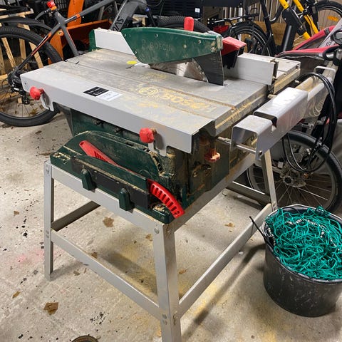 Bosch bordrundsag med stativ. Sagblad og arbeidsflate i metall. Utstyrt med hjul og sammenleggbart stativ for enkel transport og oppbevaring. Egnet for presisjonskutting av tre og andre materialer.