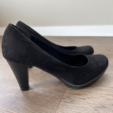 Skoene er pent (og lite) brukt - men setter som godt brukt grunnet synlig slitasje på sålene. Mener uansett dette relativt normal slitasje, i tillegg til et lite merke i skinnet bak på den ene skoen (se bilde). Ingen hull eller større skader.