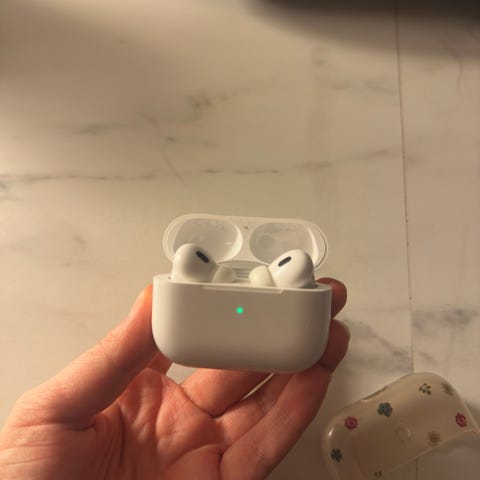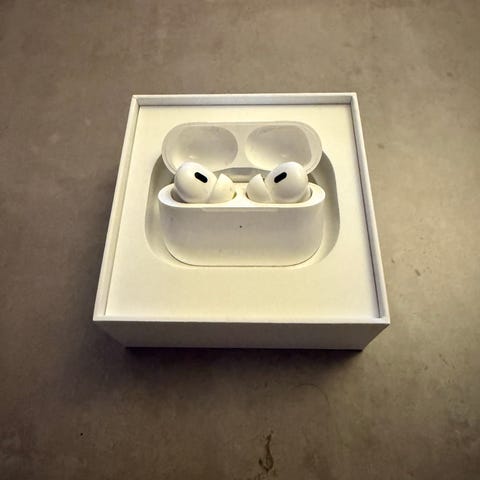 Selger AirPods Pro 2. generasjon. Høyre AirPod har blitt mistet i bakken og slipper nå gjennom støy / har redusert lydkvalitet. Venstre AirPod fungerer som normalt.