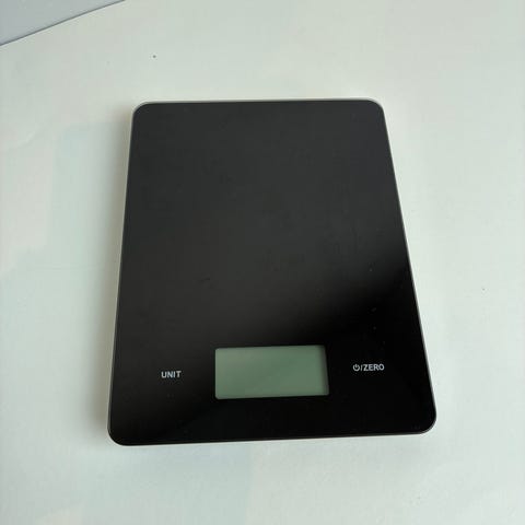 Bodum digital kjøkkenvekt med svart base og klar plastskål. Vekten har digitalt display og to røde knapper for funksjonskontroll.