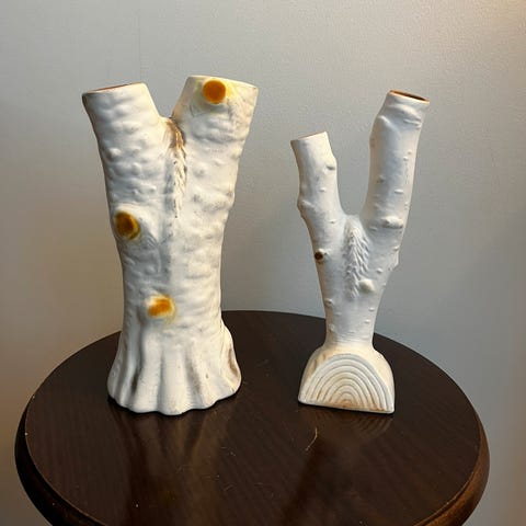 En vintage vase fra Eie Stentøifabrik, Egersund, i den klassiske bjørkestamme modellen. Glasert terrakotta med påmalte detaljer.