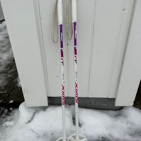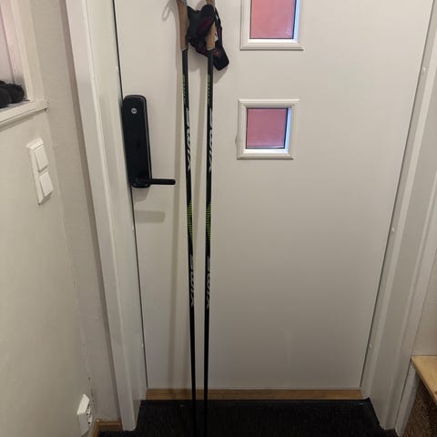 Swix langrennsstaver, to par, egnet for bruk i langrenn. Stavene har justerbare stropper og ergonomiske grep, designet for effektiv kraftoverføring under skigåing.