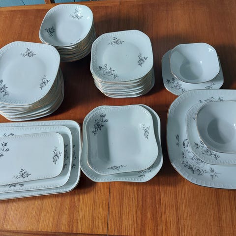 Selger svært pent og lite brukt vintage middag og kaffeservise fra Wawel porselen. 12 stk kaffekopper, 12 stk skåler, 12 stk asjetter, 12 stk frokosttallerkener, 11 stk middagstallerkener, 12 stk suppe/desserttallerkener, 2 stk serveringsboller, 3 stk serveringsfat i forskjellig størrelse, 1 stort rundt fat, 1 stk serveringsbolle med lokk, 2 stk sausenebb. Det er et lite skår på 1 suppe/desserttallerken og et lite skår på 1 asjett, dette er lite synlig. Ellers er alt i svært god stand og ser ubrukt ut. Servise er fra tidlig 70-tallet. Alt selges samlet. Må hentes.