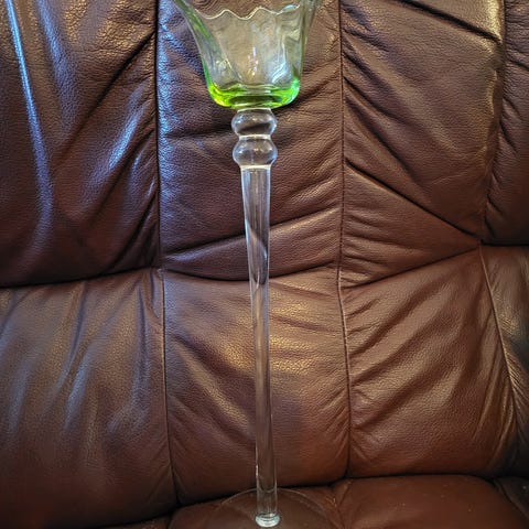 Lysestake i pressglass. Mulig uran. Hel og fin. 26 cm høy. Kan sendes mot at kjøper betaler porto på 69.-