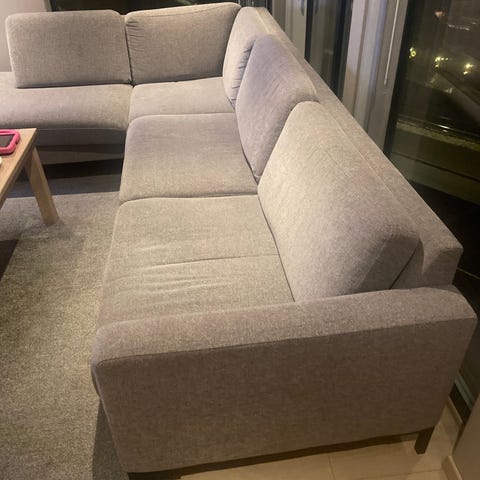 Grå sofa med sjeselong. Pent brukt. Høyde er 68 cm bak på sofaen, så kommer puten litt over kanten. Sjeselongen er 95 cm bred. Og 140 cm dyp. 2 seteren er 160 cm bred