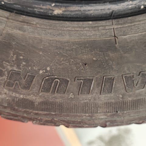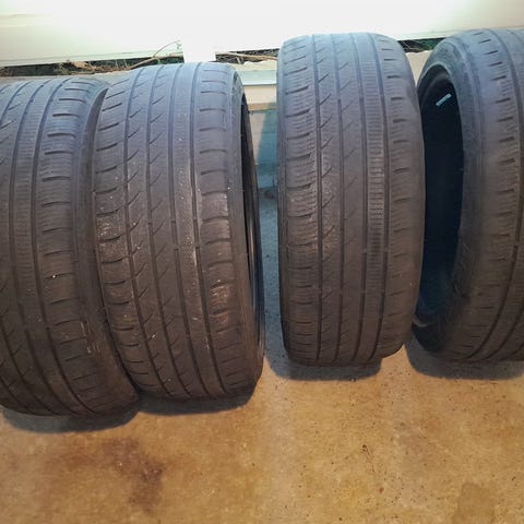 4 dekk med felger. dekkene ser sliten ut anbefaler ikke å bruke den. Men felger ser fint ut uten noe skade.