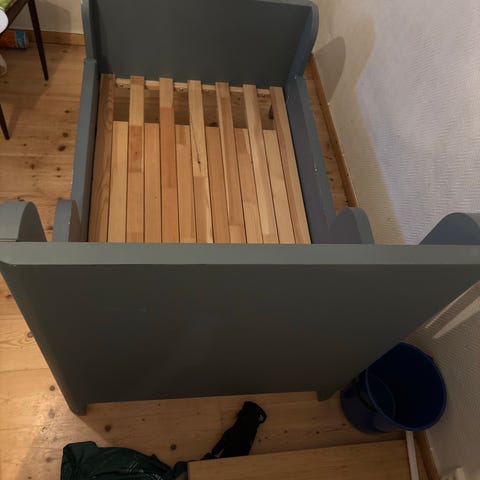 Uttrekkbar barneseng. Madrassen som ligger i er 60x115cm. Måler på det minste 60x80cm. Vokser med barnet. Kan trenge et malingsstrøk, eller brukes som den er☺️ må hentes snarest. Ren madrass