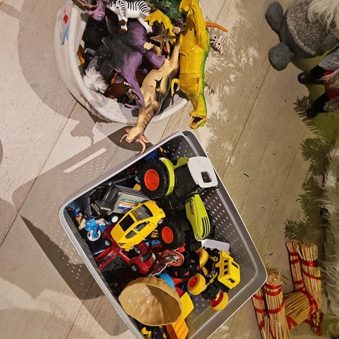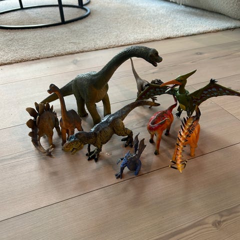 Sett med ulike leker inkludert dinosaurfigurer, små biler i forskjellige farger og modeller, samt diverse figurer og leketøy. Materialer og størrelse varierer mellom lekene. Egnet for barn. Selges samlet for kr 500, men også åpen for å selge deler av det. Helst dinosaurer samlet, biler samlet, og det andre kan diskuteres 😊