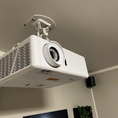 Optoma 4K prosjektor med rammelerret og takfeste.