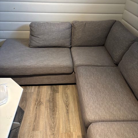 Som bildene viser er det enndel nupper grunnet hund, samt litt hull på ryggen som skjules av putene etter hund som har kost seg litt for mye når putene var av. Denne skaden har ikke noe å si for komforten i sofaen.