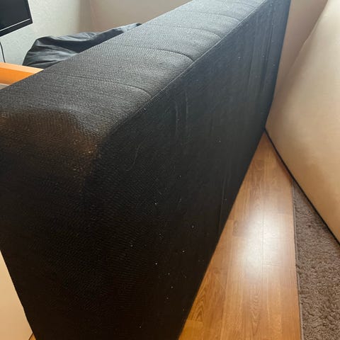 Jysk enkeltseng med tilhørende madrass og ben. Sengen har et enkelt og funksjonelt design med grått stofftrekk på rammen. Det følger med 2 overmadrasser og madrassbeskytter.