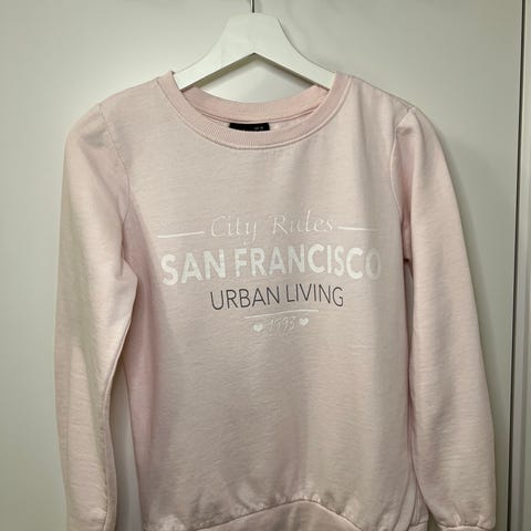 Søt lyserosa genser med kul tekst, perfekt å bruke på treningssenteret, komfortabel, kun brukt én gang. Selger den fordi størrelsen er for stor for meg.