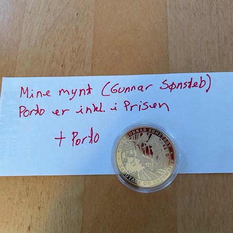 Gunnar Sønstebø minnemynt.Den er en samlerobjekt som kan brukes til historisk eller numismatisk formål.porto er inkl. har vipps