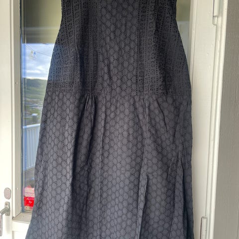 Komfortabel og elastisk kjole i mykt stretchstoff. Svart base med abstrakt mønster i røde, hvite og grå toner. Stoffet faller pent og er behagelig å ha på.