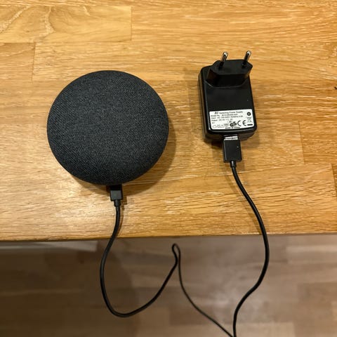 Google Nest Mini smart høyttaler i svart farge. En kompakt enhet designet for stemmestyring og trådløs musikkavspilling.
