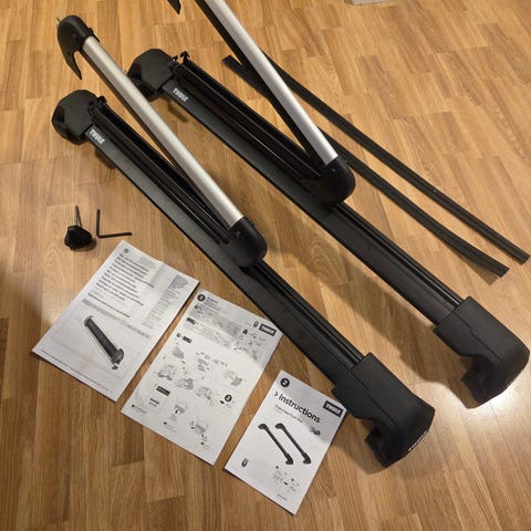 Thule WingBar Edge 958X 958 XB takstativ i aluminium. Designet for lav profil og sikker montering på tak, egnet for ulike kjøretøy. Produktet inkluderer stenger og monteringsutstyr.