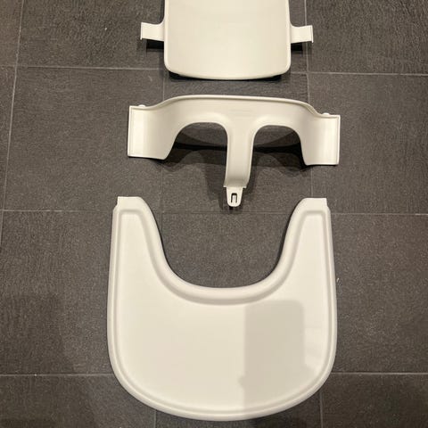 Pent brukt tilbehør til Stokke Tripp Trapp barnestol i hvit farge, bestående av tablett (spisebrett) og støttekomponenter (bøyle). Passer til ny modell fra 2000-tallet.