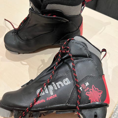 Alpina langrennsko i størrelse 31, farge sort. Skoene har glidelås og snøring bakenfor