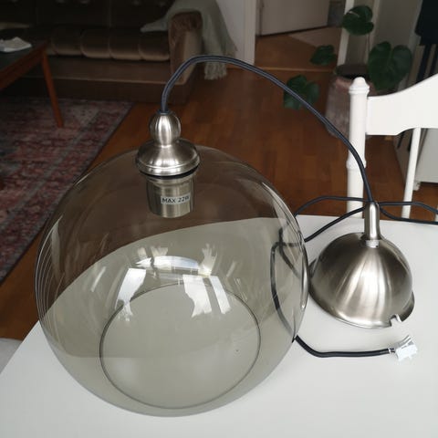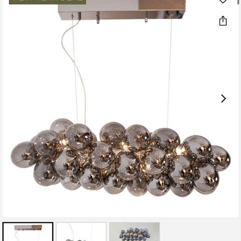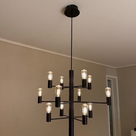 Klassisk form med et moderne uttrykk. 12 dimbare lyskilder sprer et varmt, stemningsfullt lys, kan plasseres over spisebordet, i en romslig hall eller trappeoppgangen. Selges grunnet flytting.