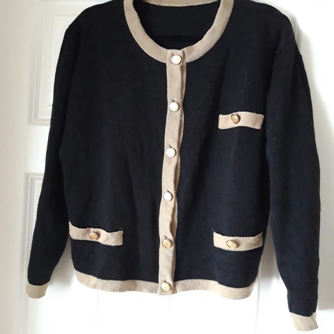 Cardigan med korte ermer . 2 knapper og mønster øverst. Svart . Str. M.