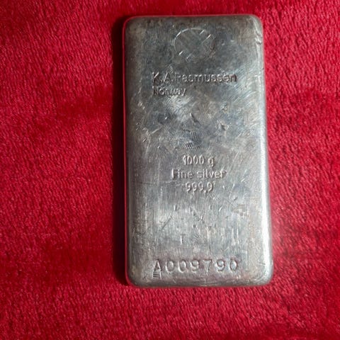 1000 gram fine silver fra Rasmussen selges,nydelig barre,investering nå som sølvprisen stiger,selges kr 35000.