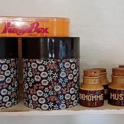 Boksene er i metall med lokk og passer fint til oppbevaring av kjeks, kaffe, te eller småting, eller som pynt på kjøkkenet. Perfekt for deg som liker landstil, retro eller nostalgisk amerikansk design.